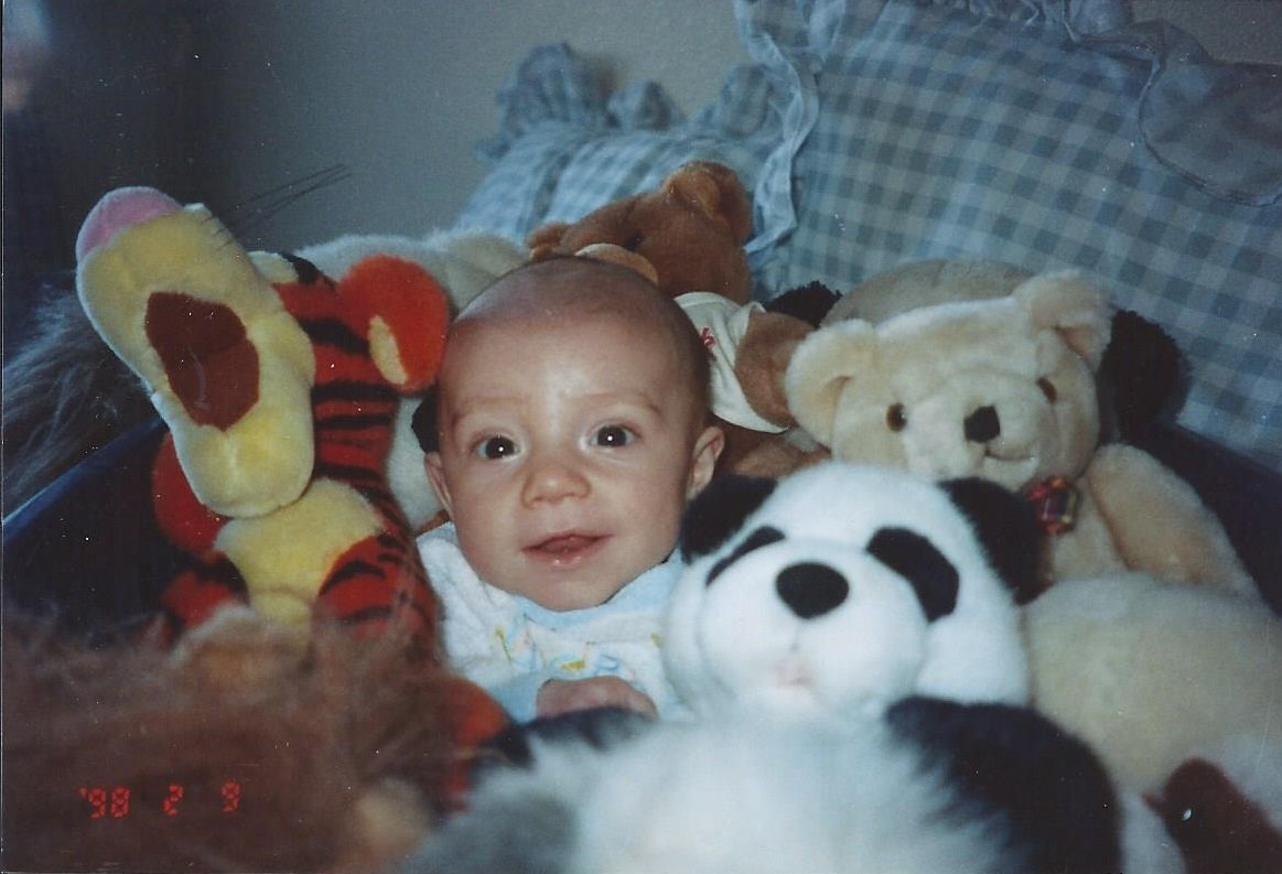 Street lights flicker on as the sky blackens unexpectedly. I turn the burrito’s face towards my shoulder, protecting him from a chill in the air.